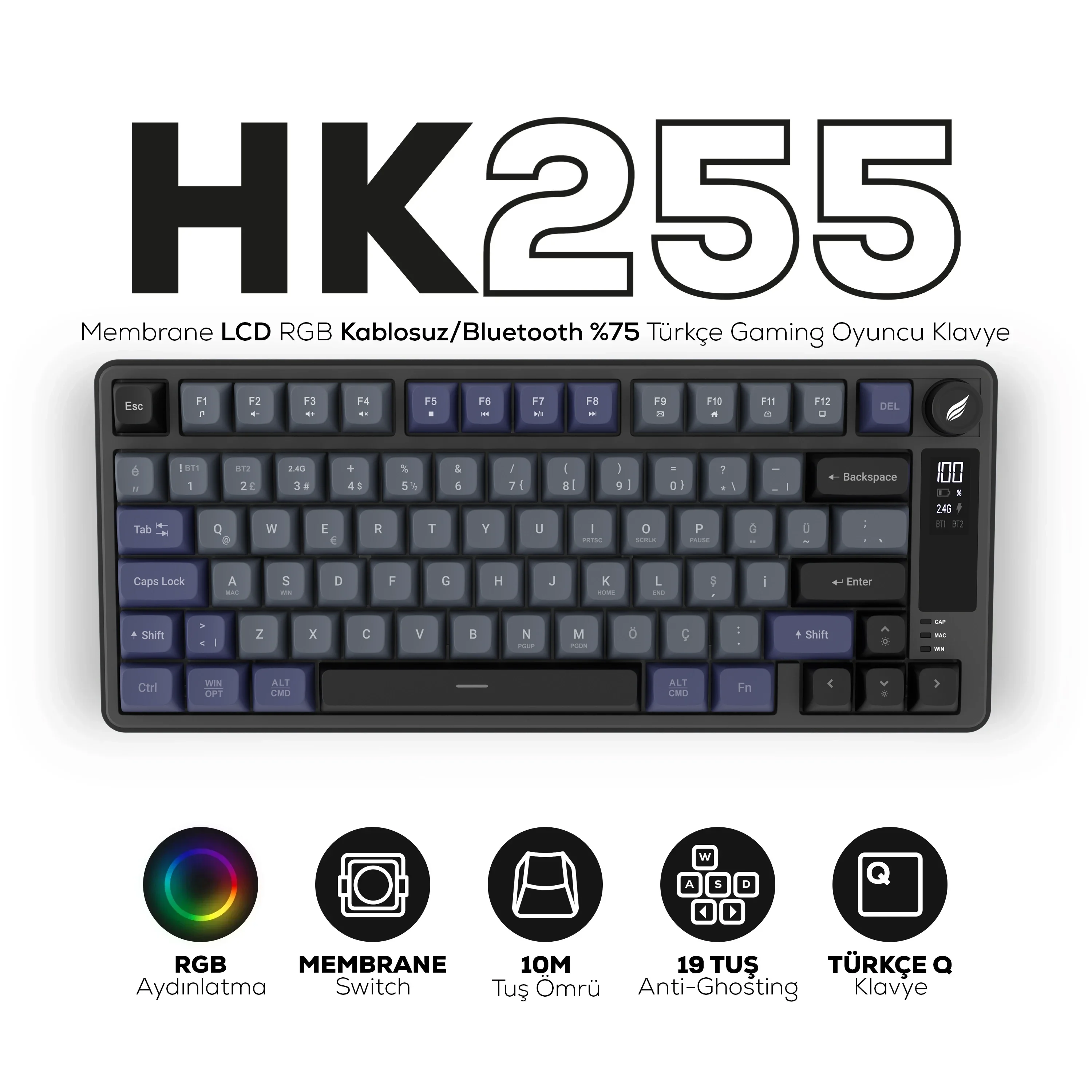 HK255 Membrane LCD RGB Kablosuz/Bluetooth Siyah %75 Türkçe Gaming Oyuncu Klavye