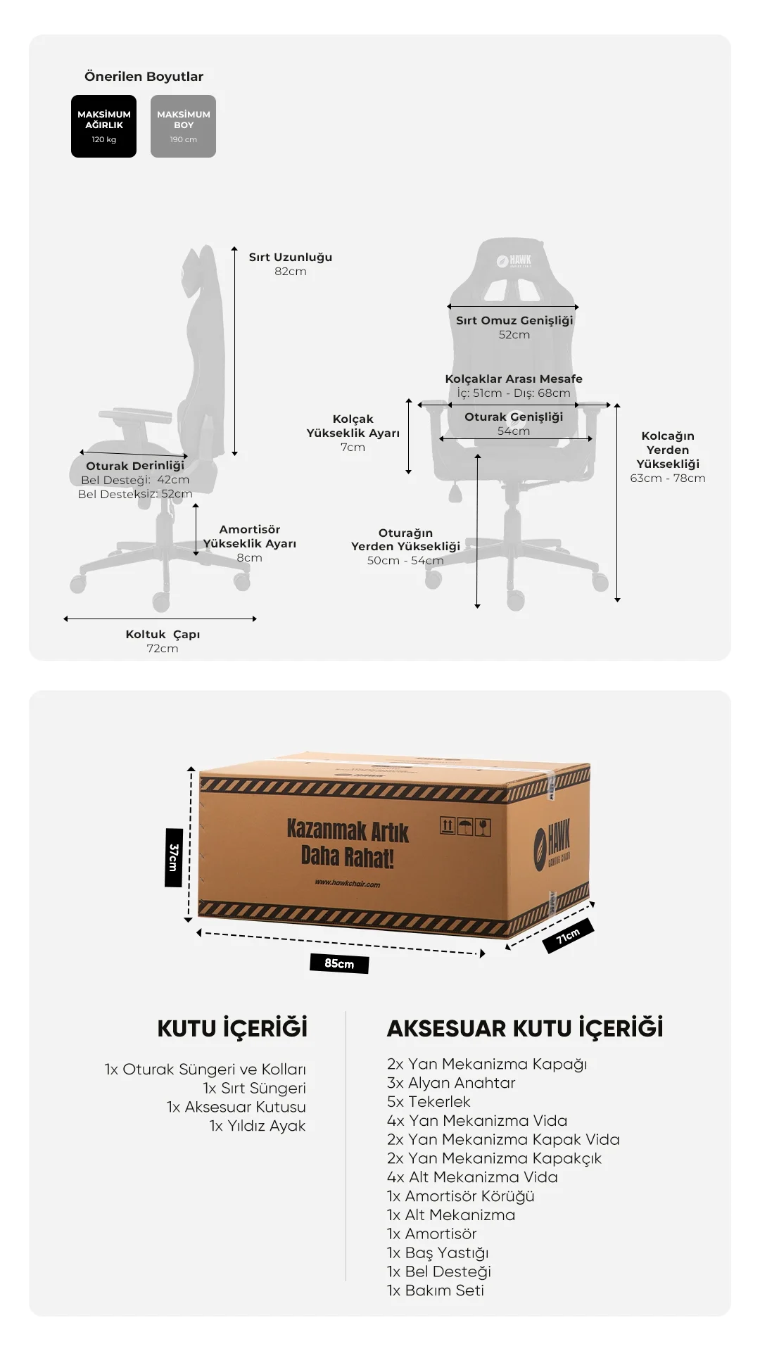 HawkChair olarak, teknik destek, iade ve geri gönderim süreçlerinde herhangi bir ek ücret talep etmiyoruz. Kargo sürecinde oluşabilecek tüm masraflar firmamız tarafından karşılanmaktadır.