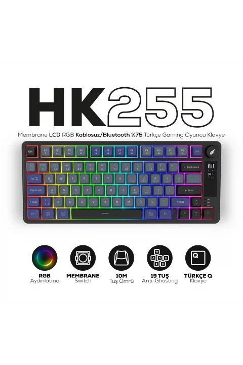 HK255 Membrane LCD RGB Kablosuz/Bluetooth Mavi Kırmızı %75 Türkçe Gaming Oyuncu Klavye