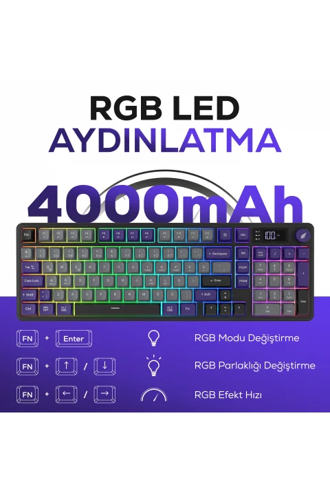 HK255 Membrane LCD RGB Kablosuz/Bluetooth Mavi Mor %75 Türkçe Gaming Oyuncu Klavye