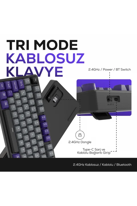 HK258 Membrane LCD RGB Kablosuz/Bluetooth Gri Mor Full Türkçe Gaming Oyuncu Klavye